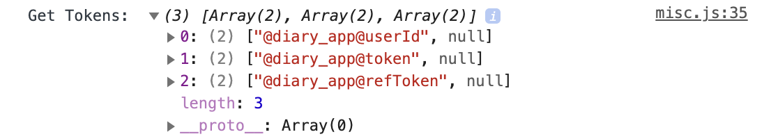 token은 앱이 실행될 때마다 불러와져야 할 것이다. 그래야 로그인 상태를 유지할 수 있기 때문이다. 그래서 /auth/index.js 에서 호출하는 메소드 componentDidMount() 안에서 호출하고 함수명은 getTokens()라고 하자. 이것도 마찬가지로 misc.js에서 정의하고 가져오자.