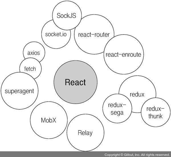 또한, 리액트는 다른 웹 프레임워크나 라이브러리와 같이 사용 가능하다.