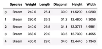 fish_input = fish[['Weight', 'Length', 'Diagonal', 'Height', 'Width']].to_numpy()