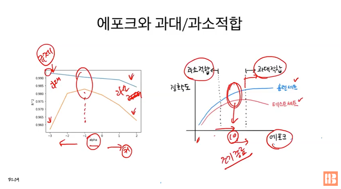 알파값에 따라 과대적합과 과소적합이 결정되듯이 에포크에 따라서도 과대적합과 과소적합이 결정됨.