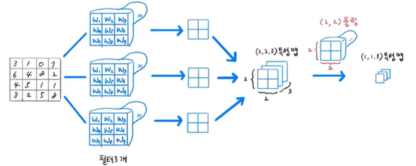 2*2 풀링 사용하면 1*1*3 특성맵이 출력됨.