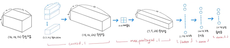 64개의 필터, 커널 사이즈 3*3, depth는 입력과 동일한 32, 활성함수, padding 그대로 사용.